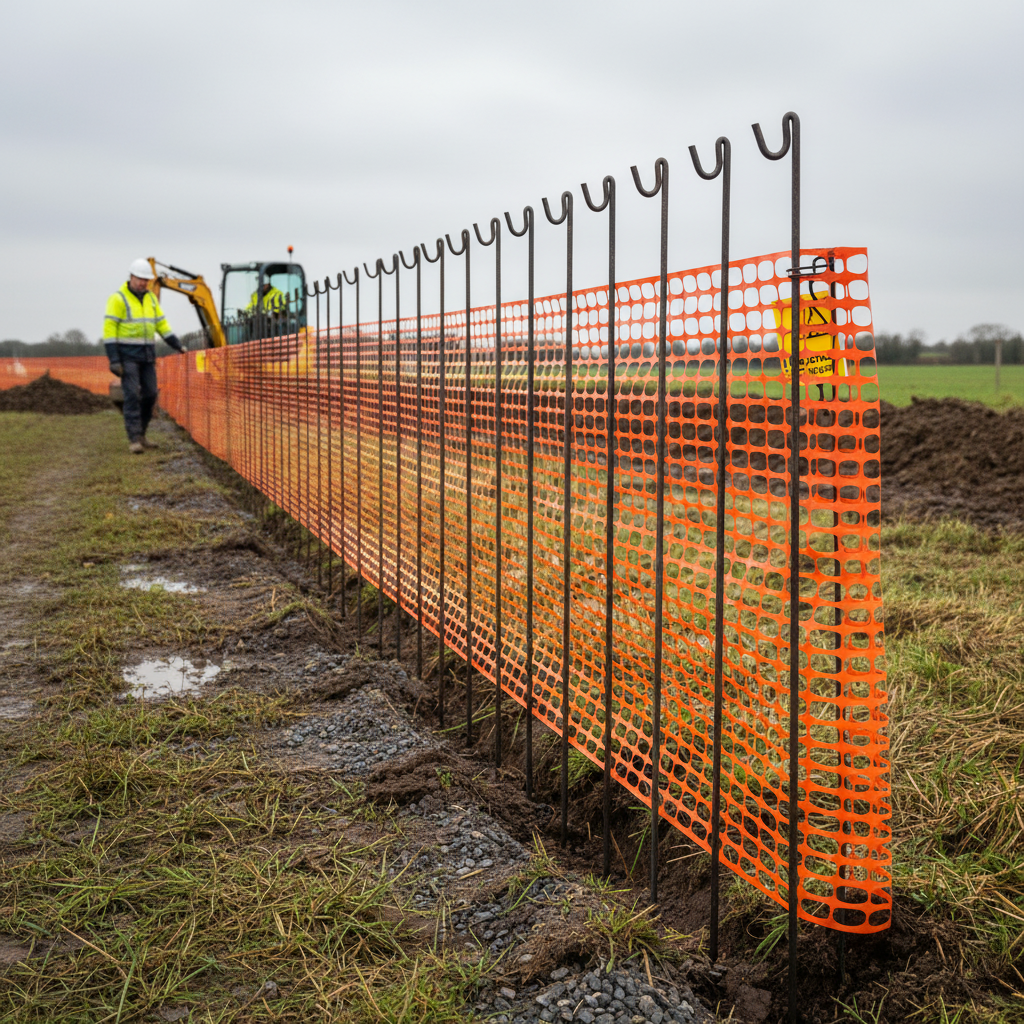 Utilize these fencing pins with barrier fencing mesh to establish a quick and efficient temporary fence solution. With just a few metal fencing pins and a roll of plastic barrier mesh, you can set up a temporary fence in minutes. This makes them ideal for numerous applications, including construction zones, crowd control at events, and even around gardens.