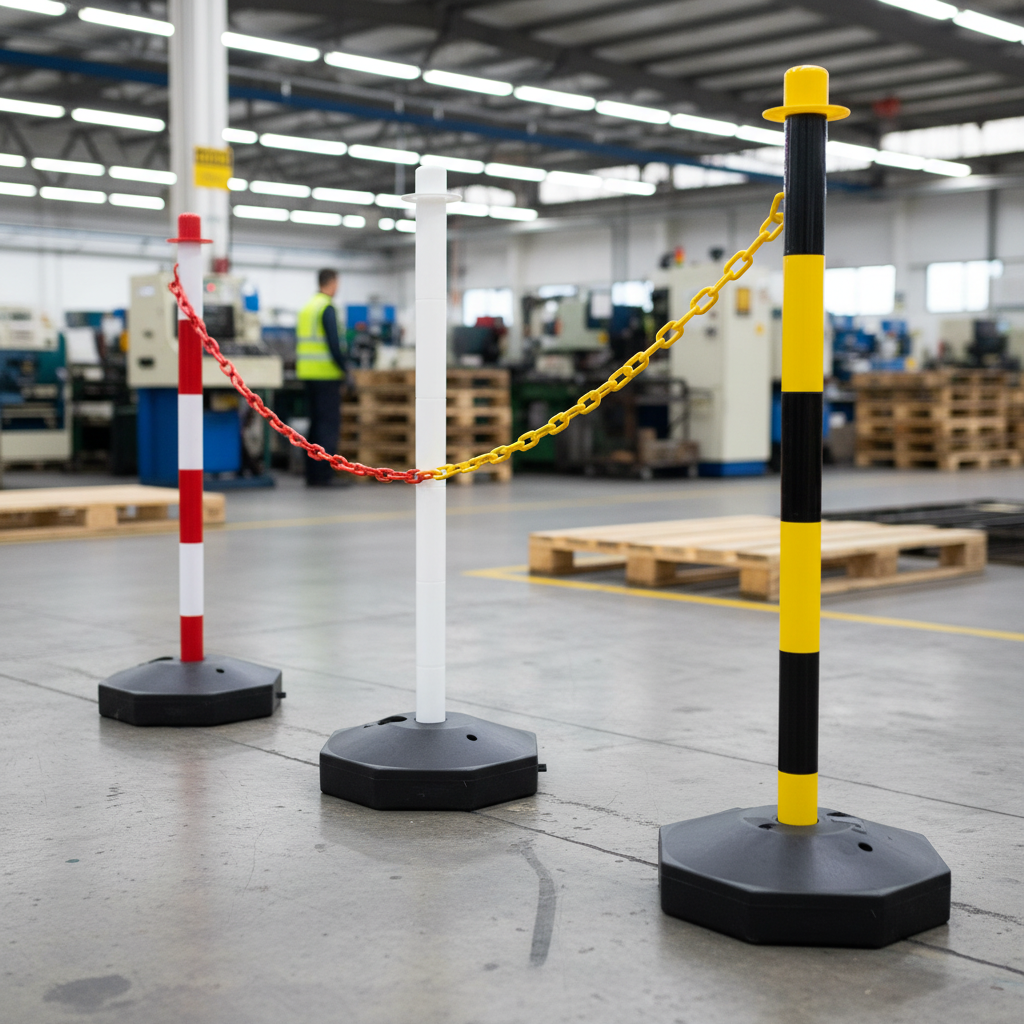 Our premium high-visibility plastic posts for chain provide a low-cost solution for creating a freestanding barrier system when paired with matching plastic chain. These posts are ideal for establishing instant distancing, demarcation, or safety barriers in various environments such as warehouses, shops, car parks, and other areas where temporary barriers are needed.