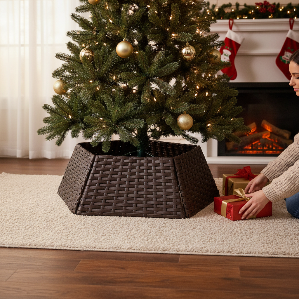 Enhance your festive decor with this Premium Faux Rattan Christmas Tree Skirt, designed to bring a touch of elegance to your holiday theme. Crafted with high-quality faux rattan, this tree skirt features a clever four-panel design that easily slots together for quick assembly and folds flat for convenient storage, making it a practical and stylish addition to your Christmas collection.