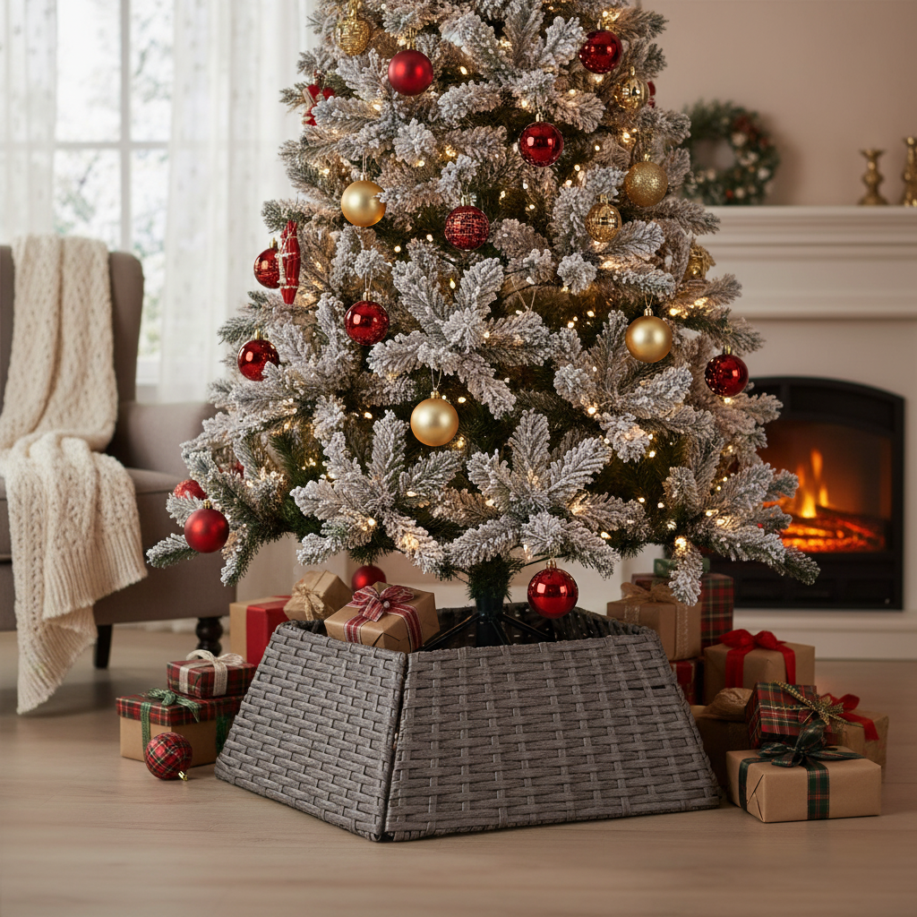 This premium faux rattan Christmas Tree skirt is designed to enhance any holiday theme this season. Its clever design consists of four panels that easily slot together, making storage a breeze compared to traditional large wicker skirts.
