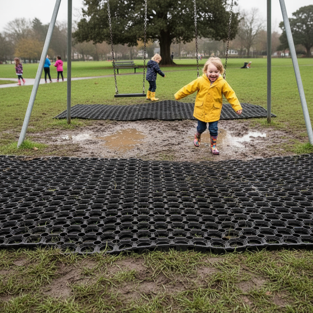 Constructed from recycled rubber, these mats are not only durable but also environmentally friendly and resistant to weather conditions. Their cellular structure allows effective drainage while permitting grass to grow through, offering a more natural appearance.