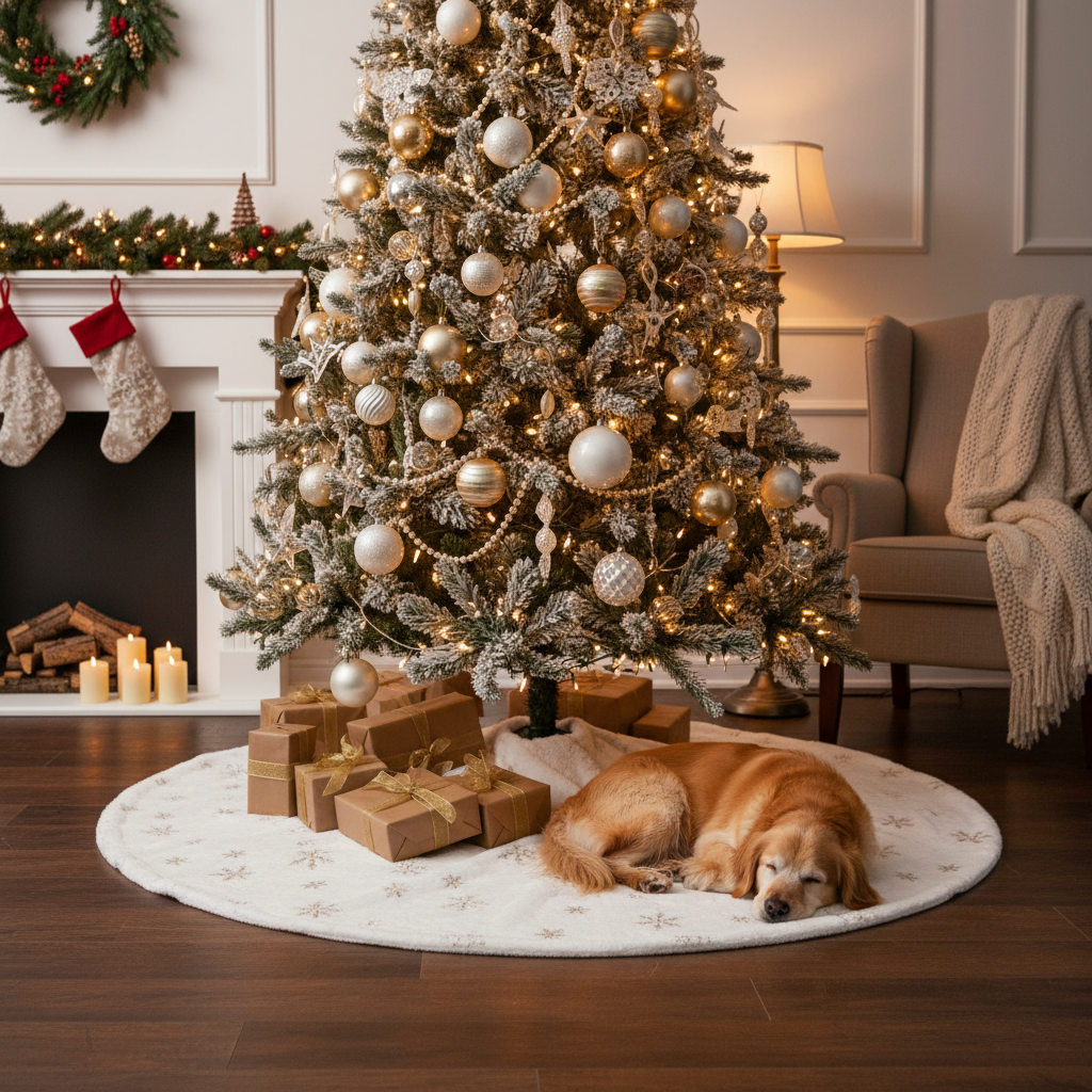 Enhance your festive decor with our Premium White Plush Christmas Tree Skirt, featuring an elegant gold snowflake design. Made from soft, high-quality plush fabric, this luxurious base will complement any Christmas theme.