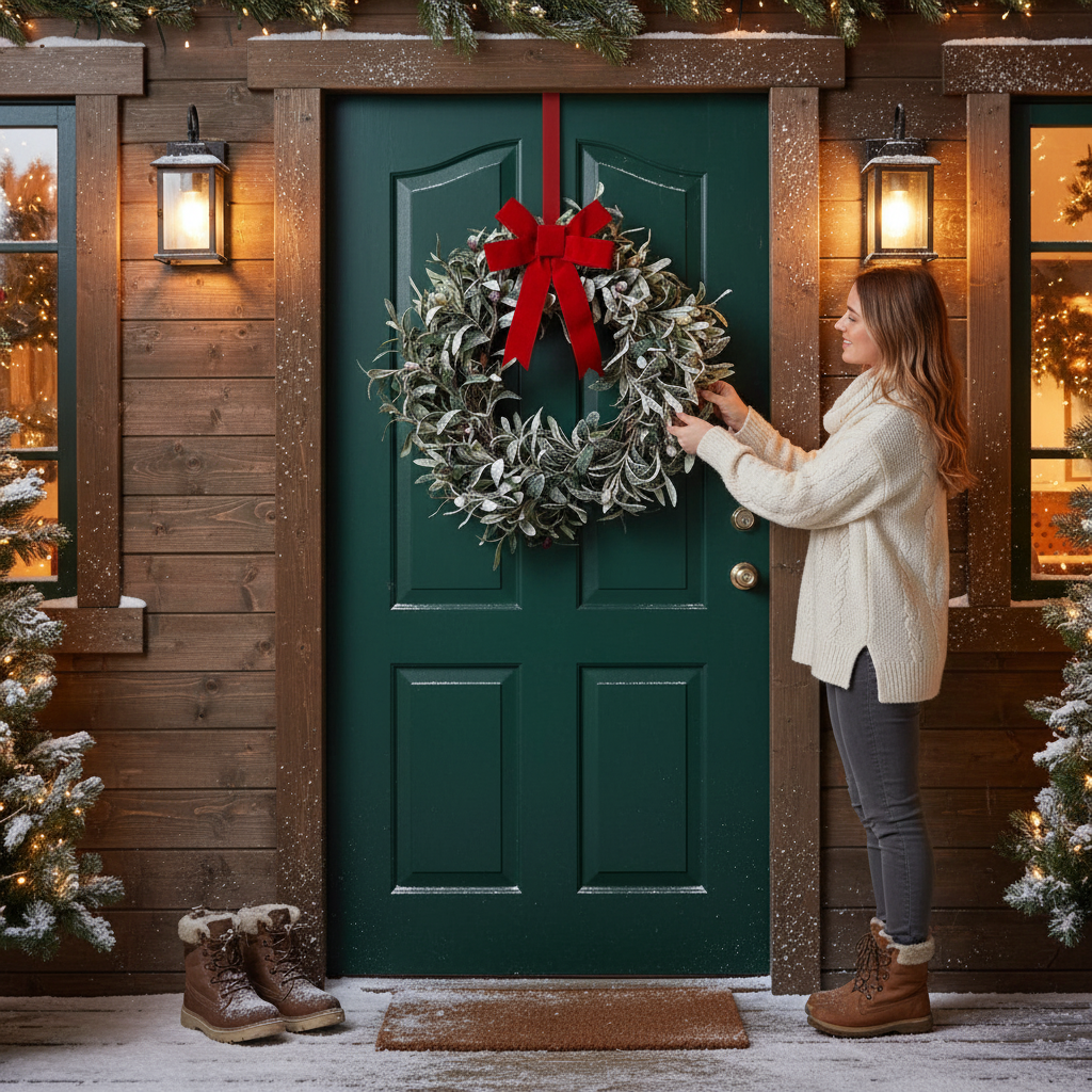 This wreath features lifelike olive leaves and berries with a subtle dusting of snow that captures the quiet magic of a winter’s morning. Its neutral tones and organic texture make it a versatile piece, ideal for dressing your front door, fireplace, or dining space with understated seasonal elegance.