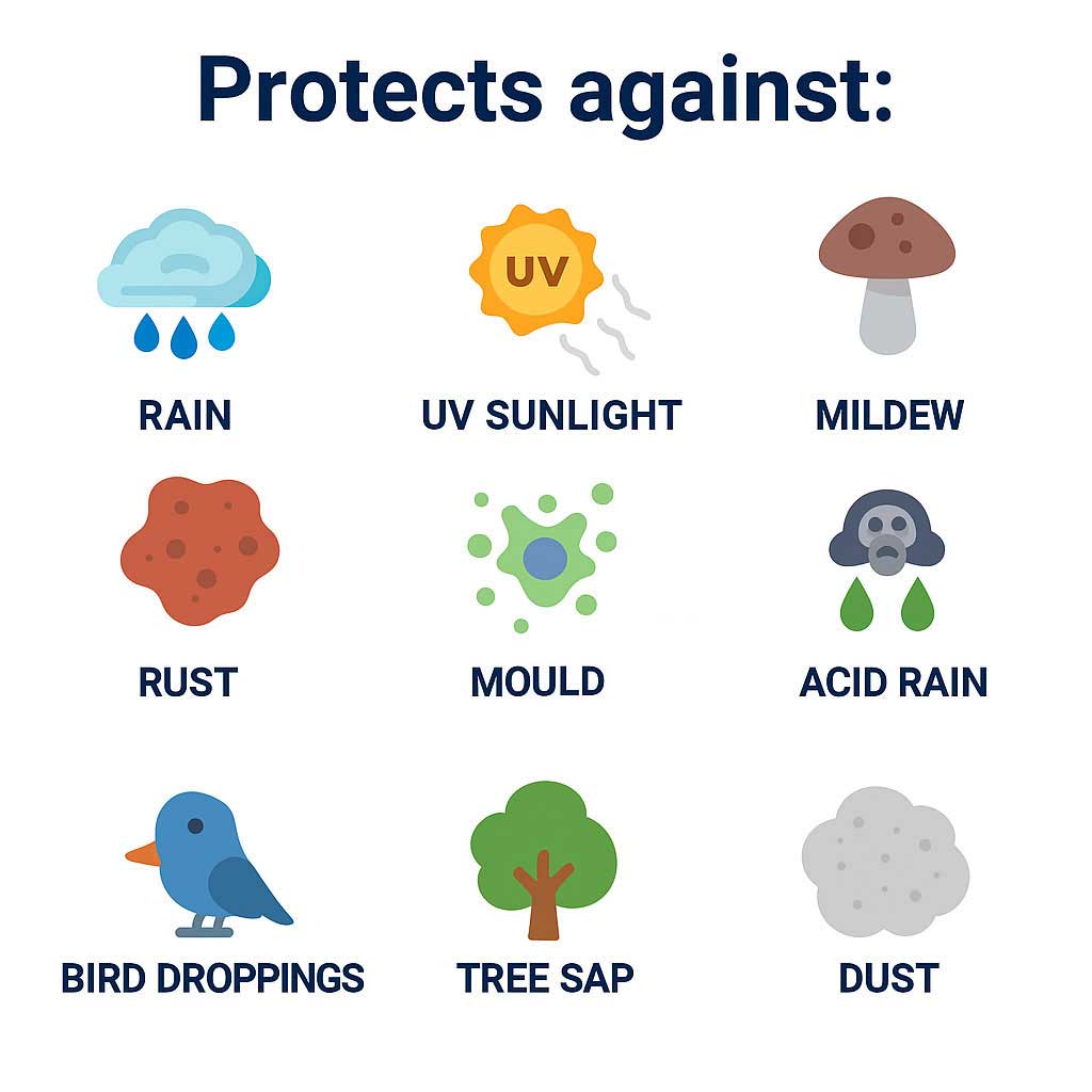 Protection: Dirt, Dust, Rain, Mild Snow, Mild UV Rays, Bird Droppings, Tree Sap, Hail