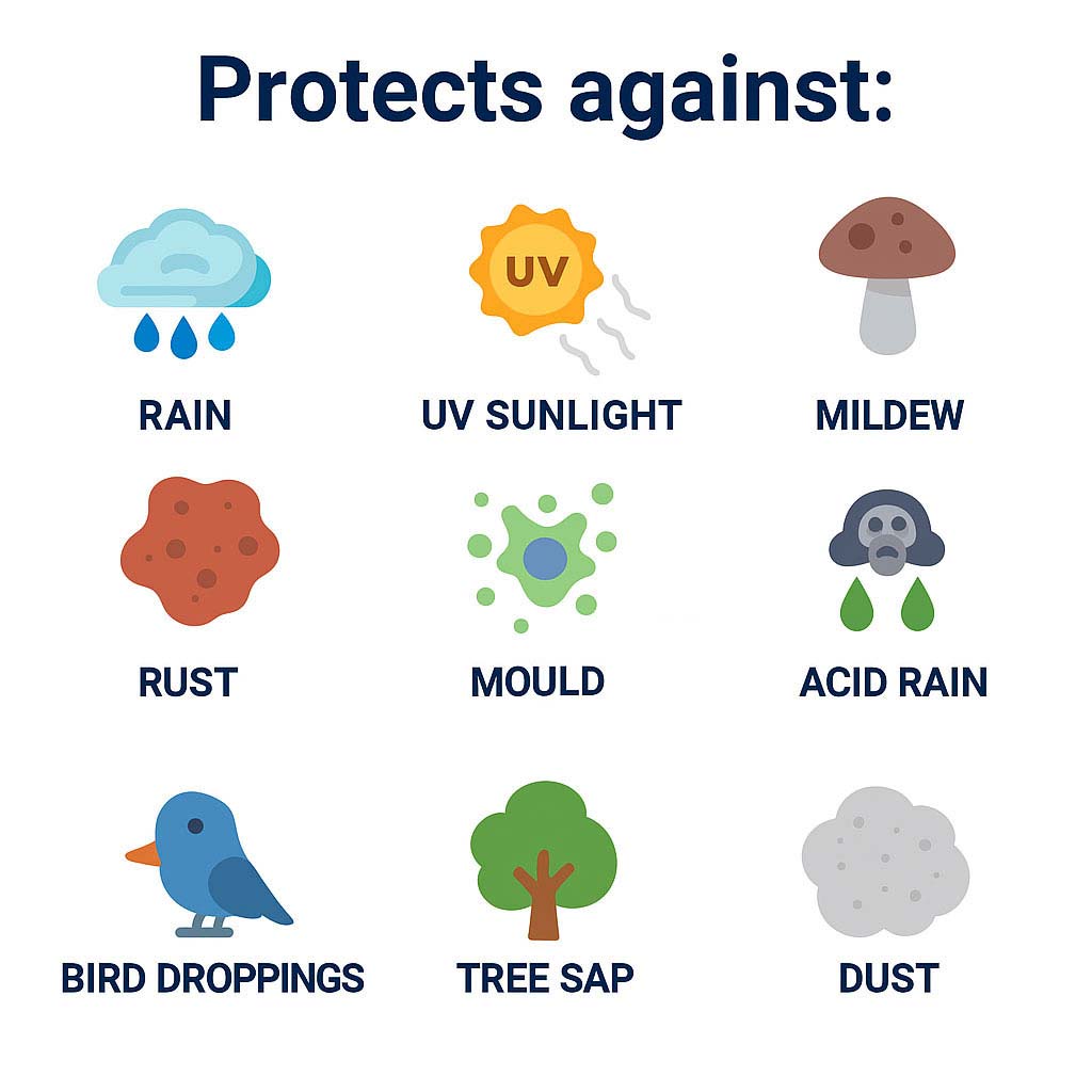 Shields against water, UV rays, rust, dust, and mild snow