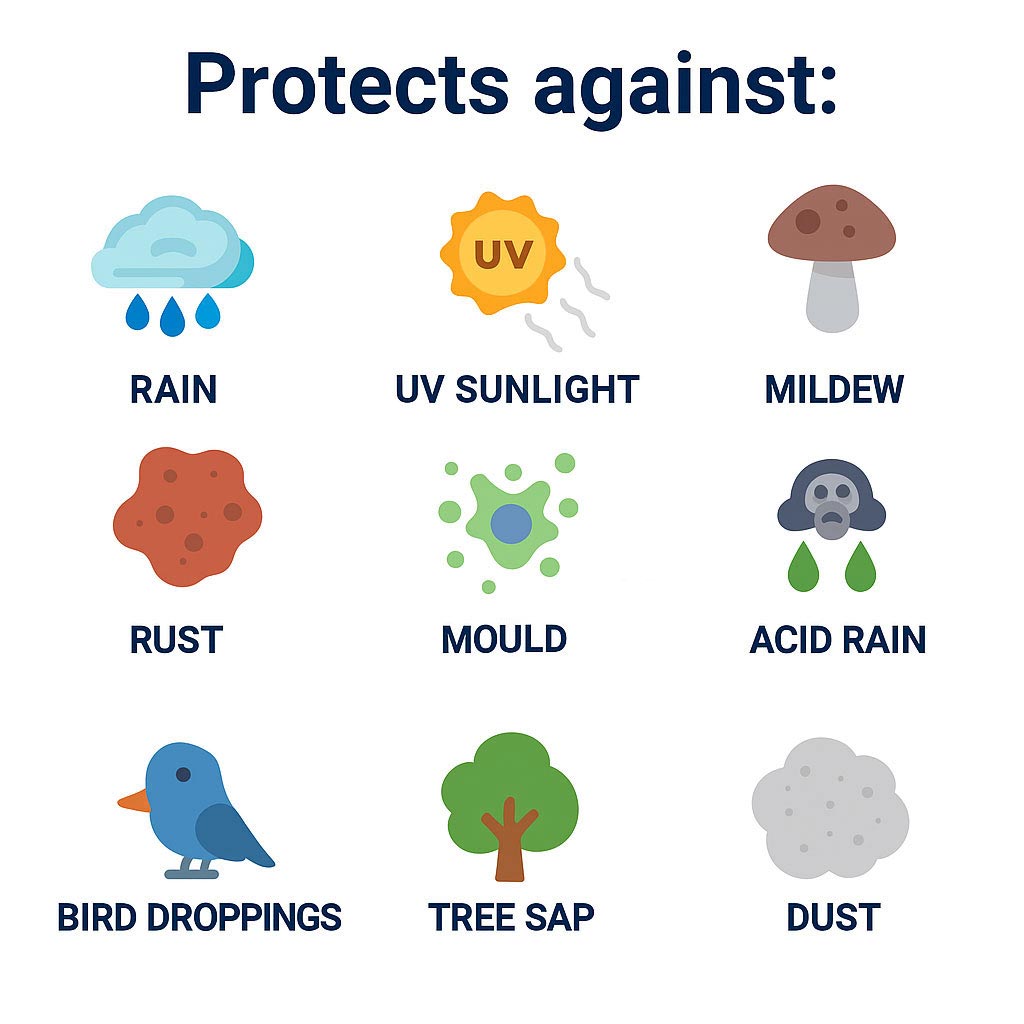Resists mould, mildew, bird droppings, tree sap, and dirt